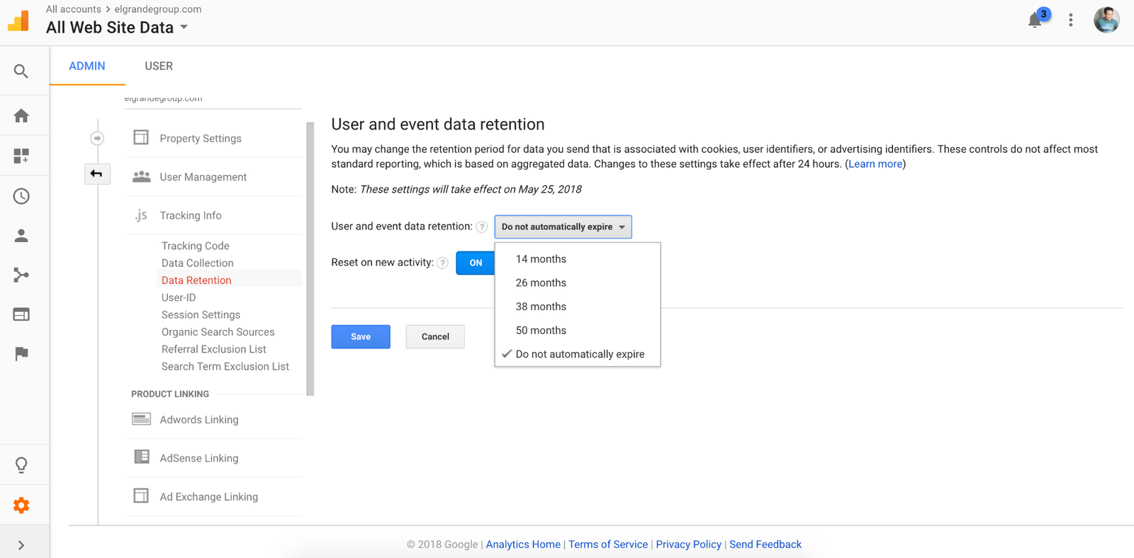 The settings should be implemented into Google Analytics right now, giving you time to become more acquainted with the feature before it becomes legally effective in late May. You can access it by opening up your Google Analytics, selecting Admin, Property, Tracking Info, and then selecting Data Retention.